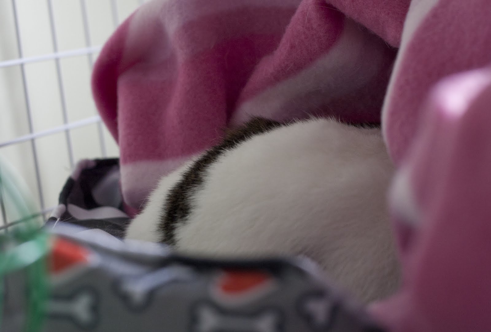 Last week I picked up some adorable pet beds for the bunnies. I wrapped them in fuzzy blankets to discourage nibbling and put them in a corner of each of the rabbit cages.